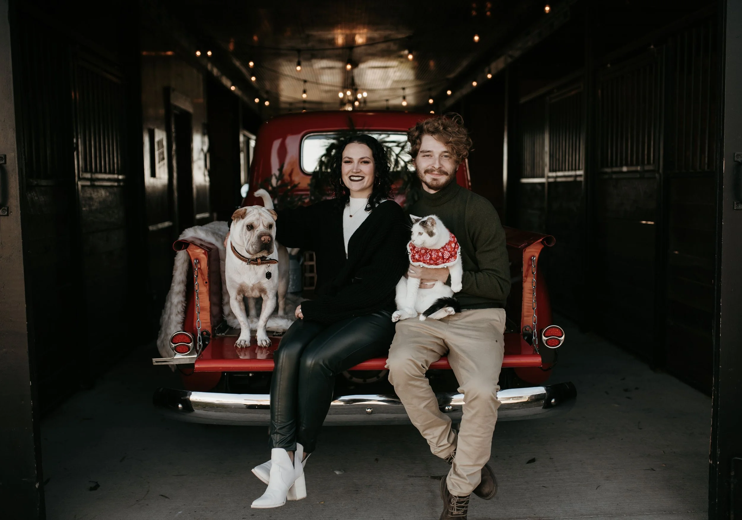 That being said, you can tell we came into 2022 with a glow up!! From 2020 to 2022 we already transformed as a couple. You can tell this is when I started to plan what we were wearing for our Christmas photos with more intention behind them. I also started making sure both of the fur babies were involved! I knew at this point my baby Shevron was geriatric (per the Vet’s words, not mine) and I knew I needed him in our family pics!